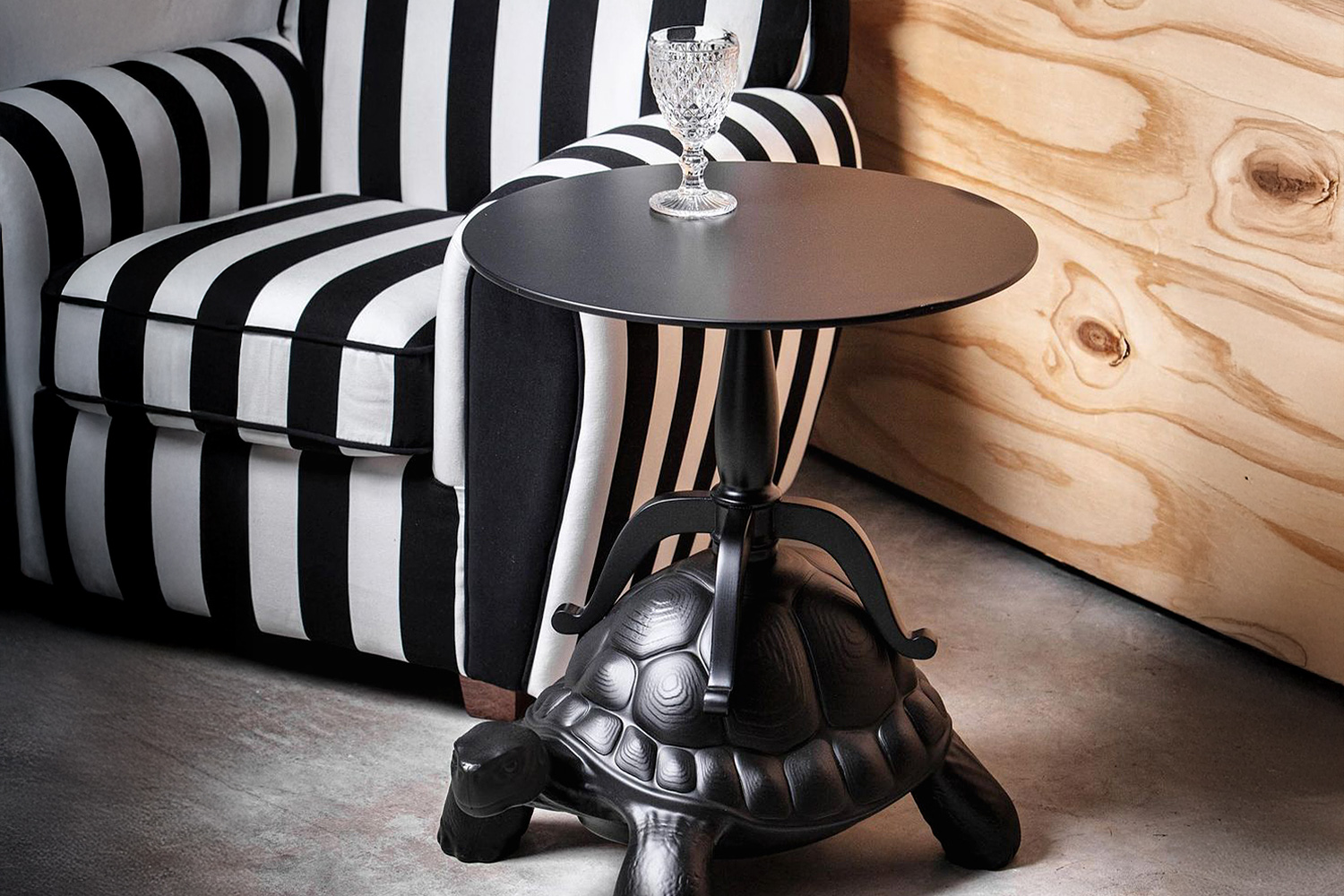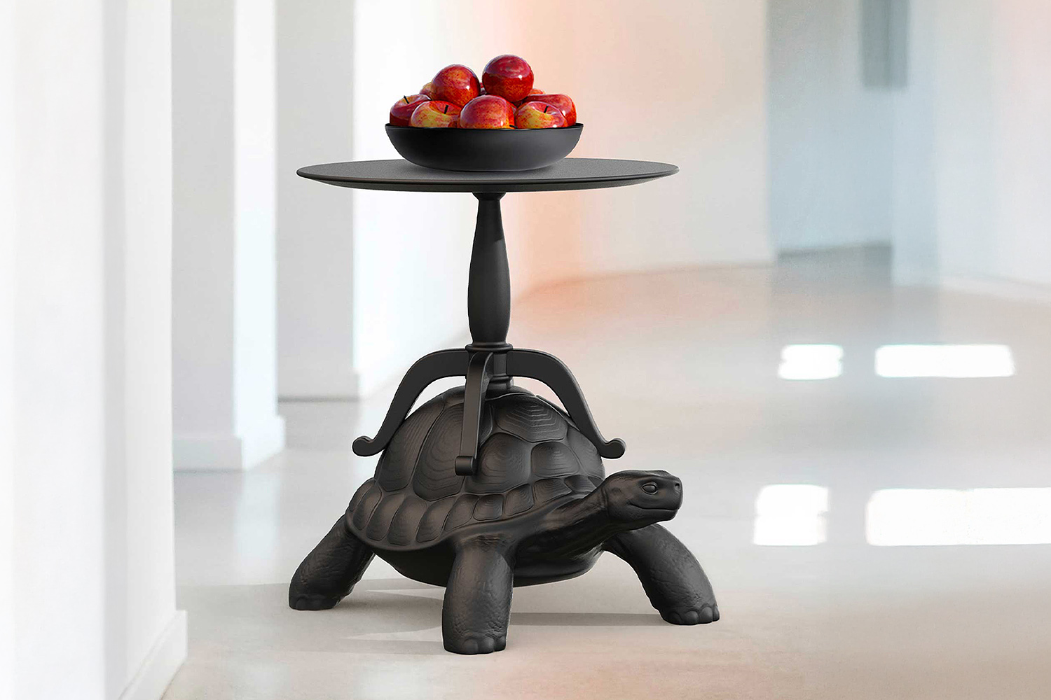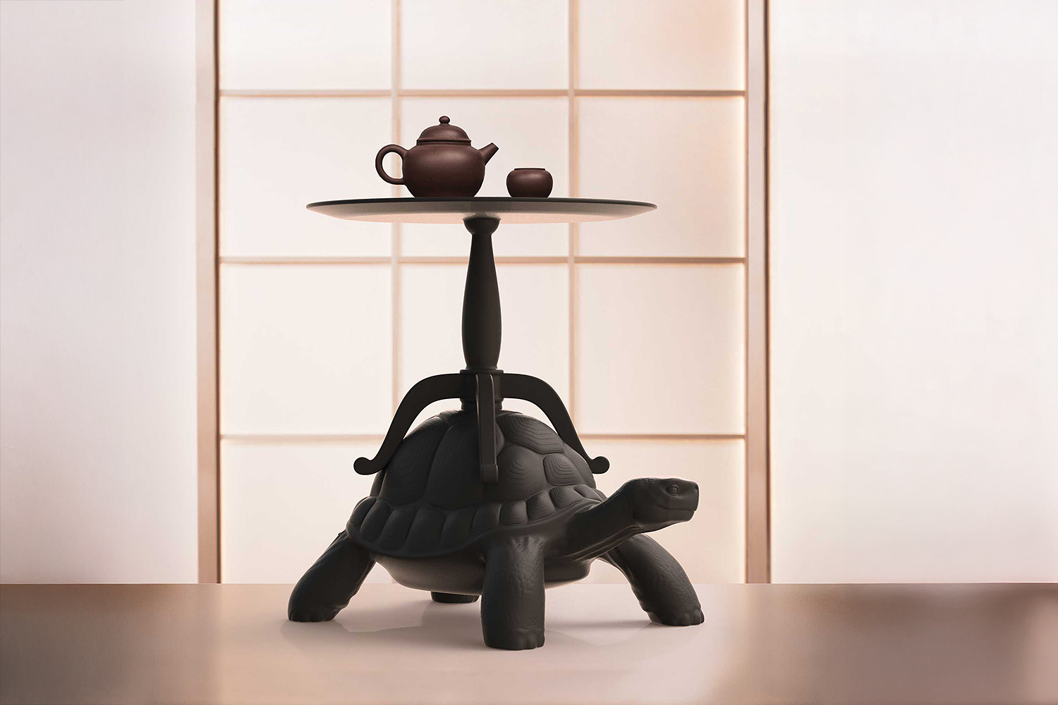 Typisch Qeeboo: Wie wäre es, wenn uns eine Schildkröte den Tee auf ihrem Rücken serviert? Der surreal angehauchte Beistelltisch begeistert mal wieder mit seinem spielerischen Design.
