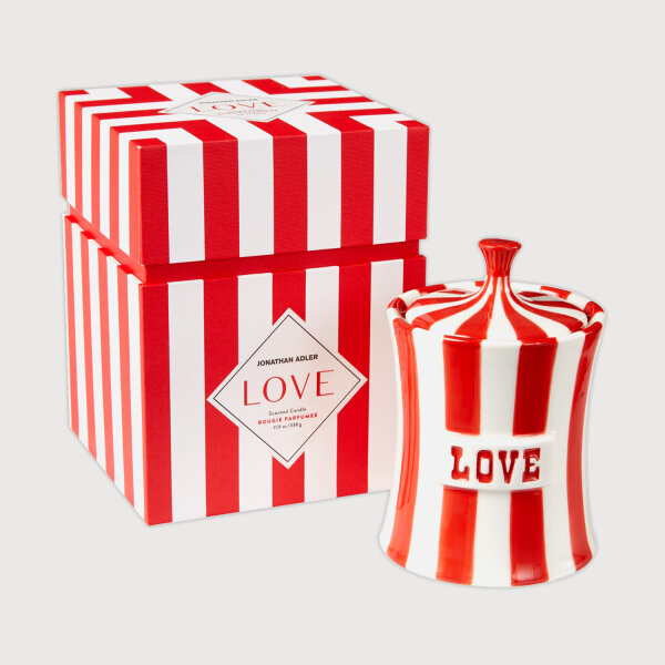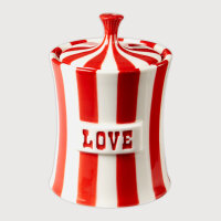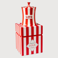 Glasiertes Porzellan mit handbemalten Streifen und Love-Schriftzug in Rot/Weiß