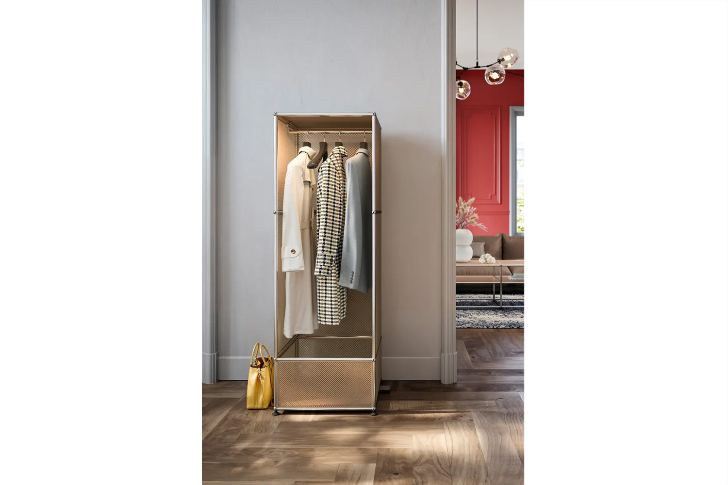 USM-Garderobe: Ideal auch für längere Mäntel und Jacken. Im unteren Bereich lassen sich Schuhe, Boxen mit Accessoires oder Handtaschen verstauen